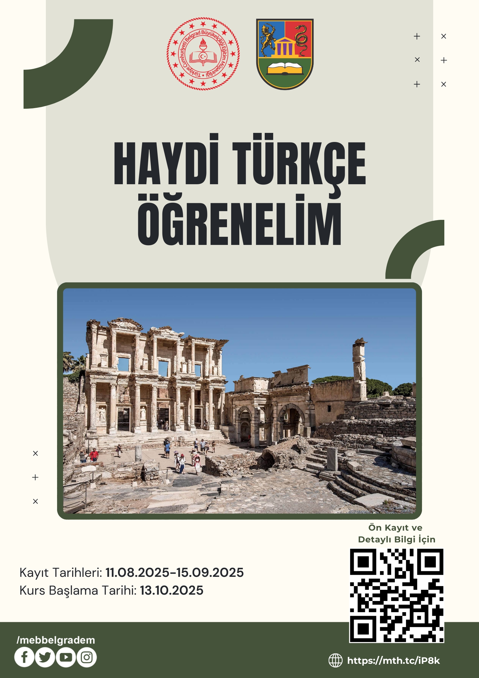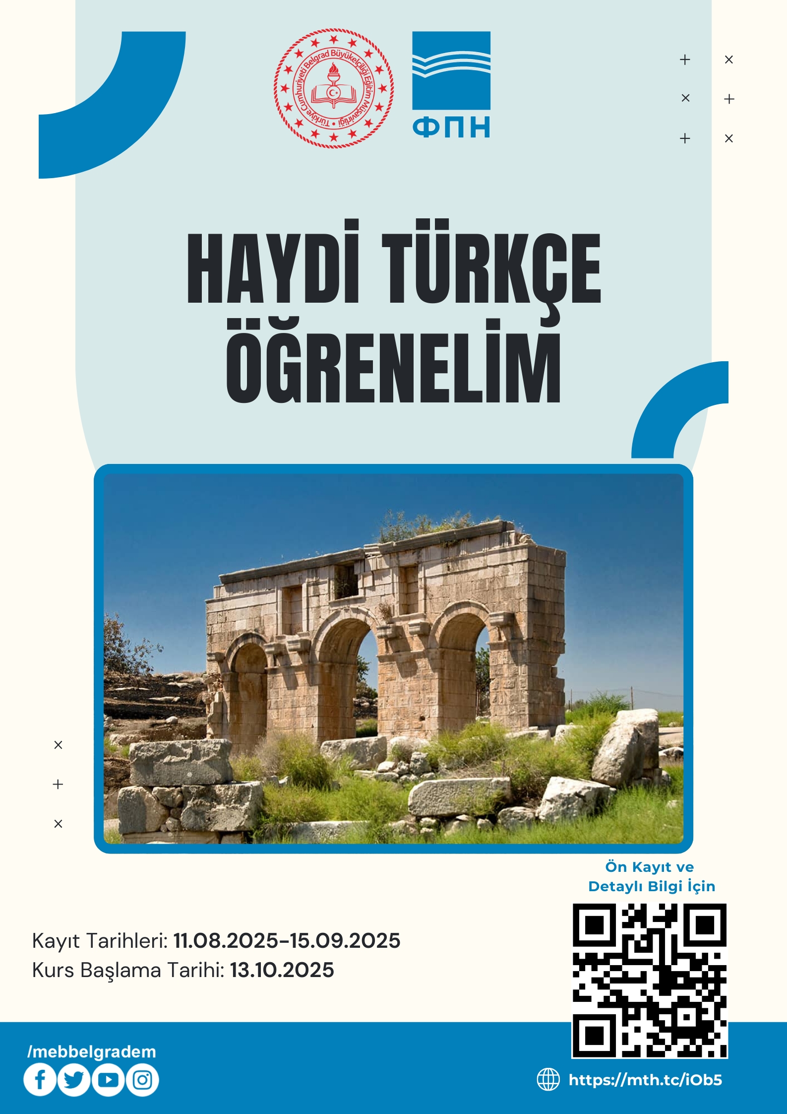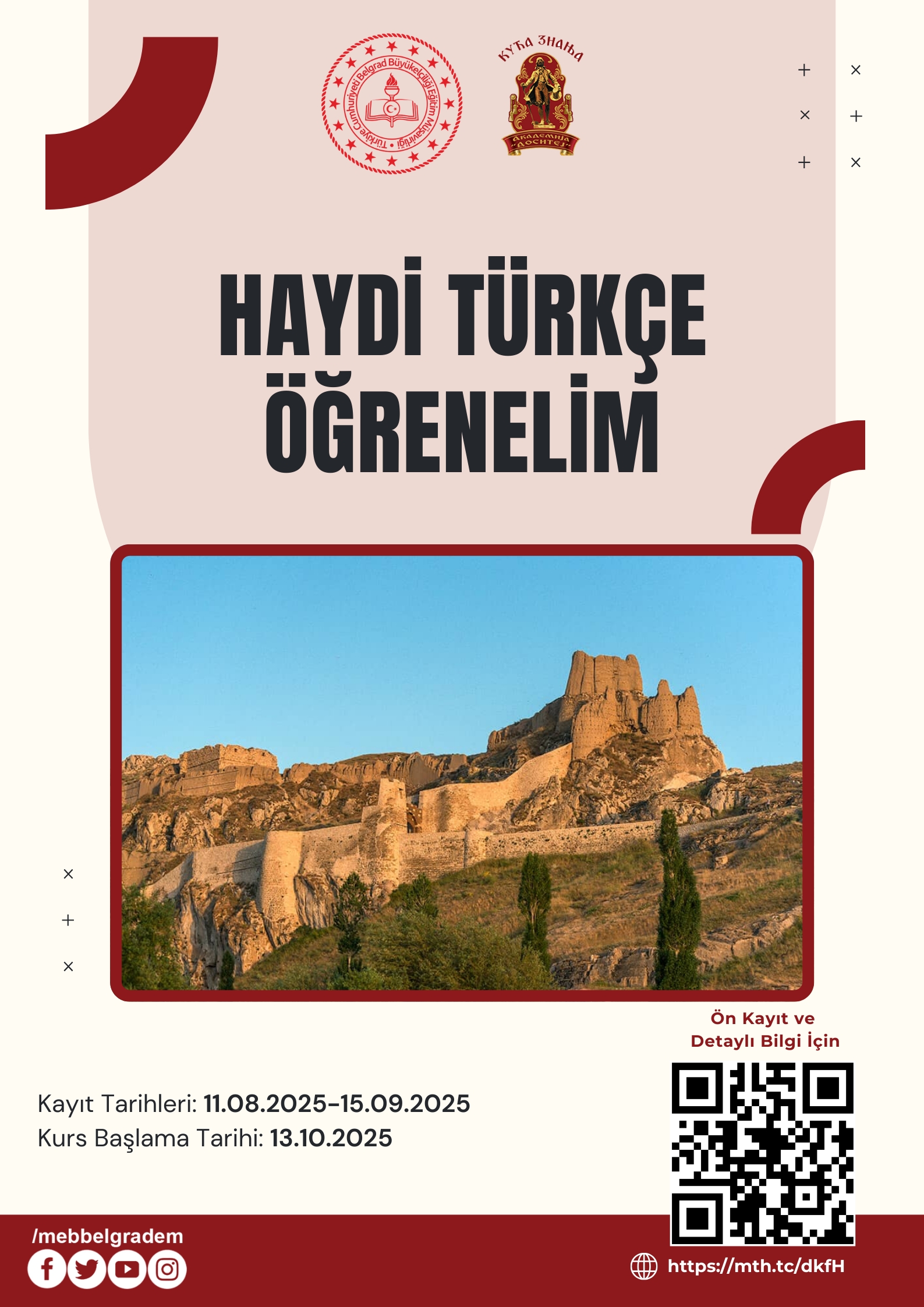 Türkiye Cumhuriyeti Belgrad Büyükelçiliği Eğitim Müşavirliği ile Belgrad Üniversitesi Siyasal Bilgiler Fakültesi iş birliğinde gerçekleştirilen Türkçe kursu kaydı için: https://mth.tc/iOb5